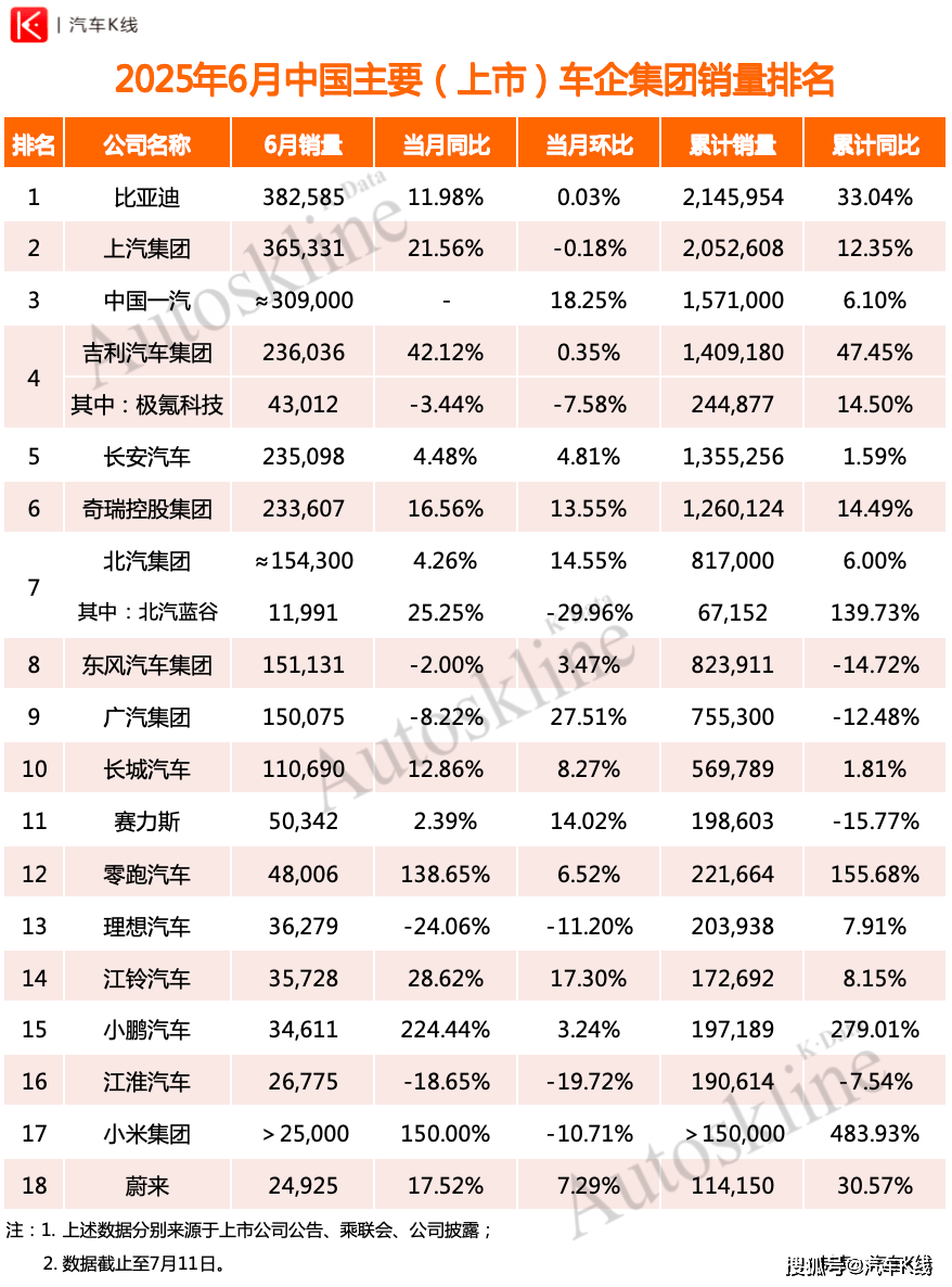 截至7月14日,《汽車K線》統計,18家中國主要上市車企/集團完成公布6月銷量業績,情況喜大普奔。