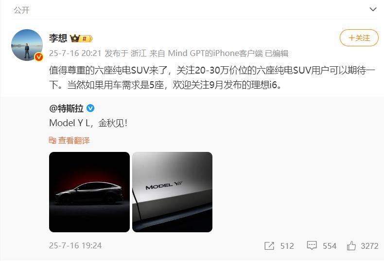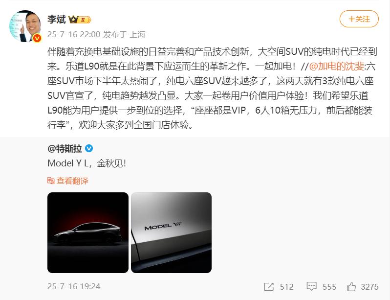 7月16日,特斯拉在官微上宣布Model YL,金秋見,引發行業關注。