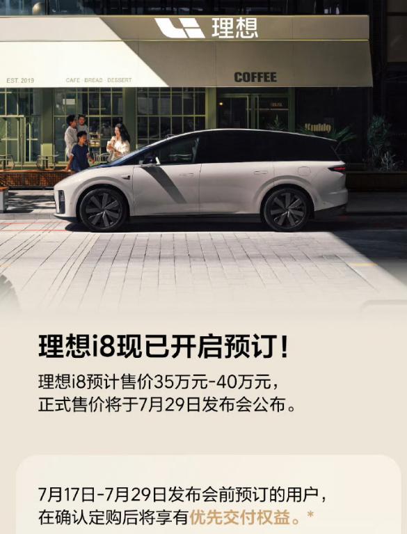 值得注意的是,7月17日,理想汽車微博發文稱,理想i8現已開啟預訂。理想i8預計售價35萬元~40萬元, 正式售價將于7月29日發布會公布。