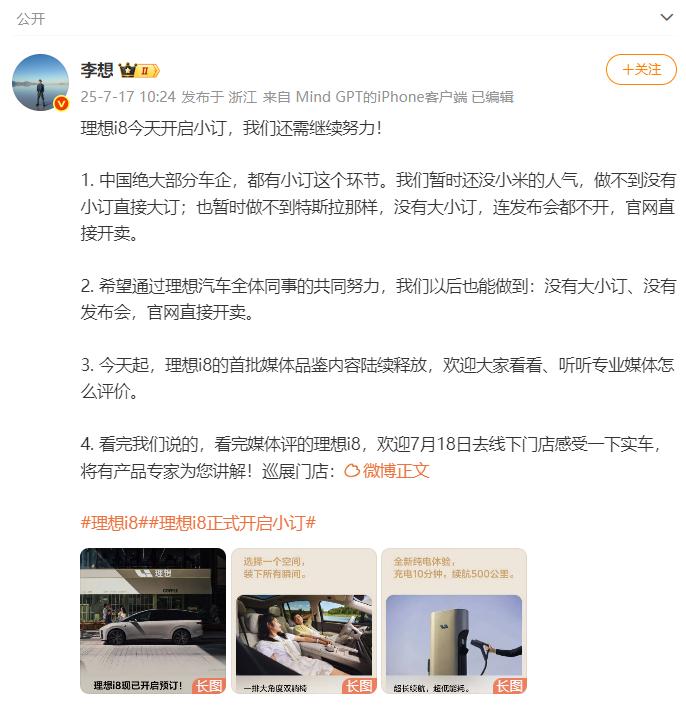 理想汽車CEO李想在其個人社交平臺發文稱:“中國絕大部分車企,都有小訂這個環節。我們暫時還沒小米的人氣,做不到沒有小訂直接大訂;也暫時做不到特斯拉那樣,沒有大小訂,連發布會都不開,官網直接開賣。”