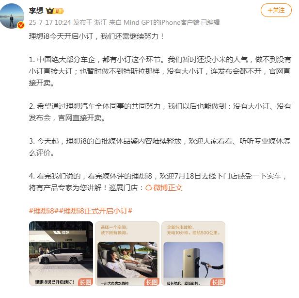 理想汽車 CEO李想發(fā)微博稱,“理想i8今天開啟小訂,我們還需繼續(xù)努力”。