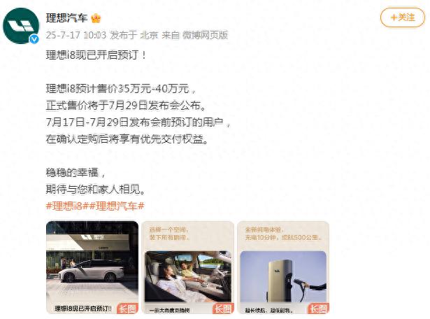 7月17日,理想汽車宣布,理想i8開啟預(yù)訂,預(yù)計(jì)售價(jià)35萬元-40萬元,正式售價(jià)將于7月29日發(fā)布會(huì)公布。