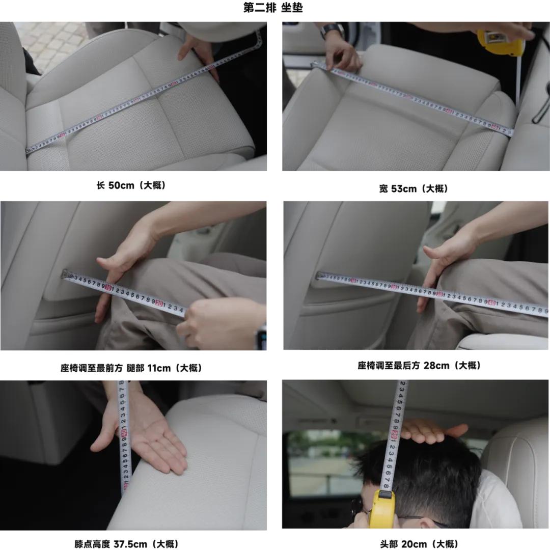 保持第一排位置不變,來到第二排,坐墊尺寸與第一排基本一致,膝點(diǎn)高度約37.5厘米。頭部空間比第一排更充裕,達(dá)到20厘米。當(dāng)座椅調(diào)至最前位置時(shí),腿部仍有11厘米空間;調(diào)至最后時(shí),腿部空間可達(dá)28厘米——顯然第二排是全車舒適性最佳的座位,不僅配備獨(dú)立座椅,還有大尺寸側(cè)窗和遮陽(yáng)簾,體驗(yàn)相當(dāng)奢侈。