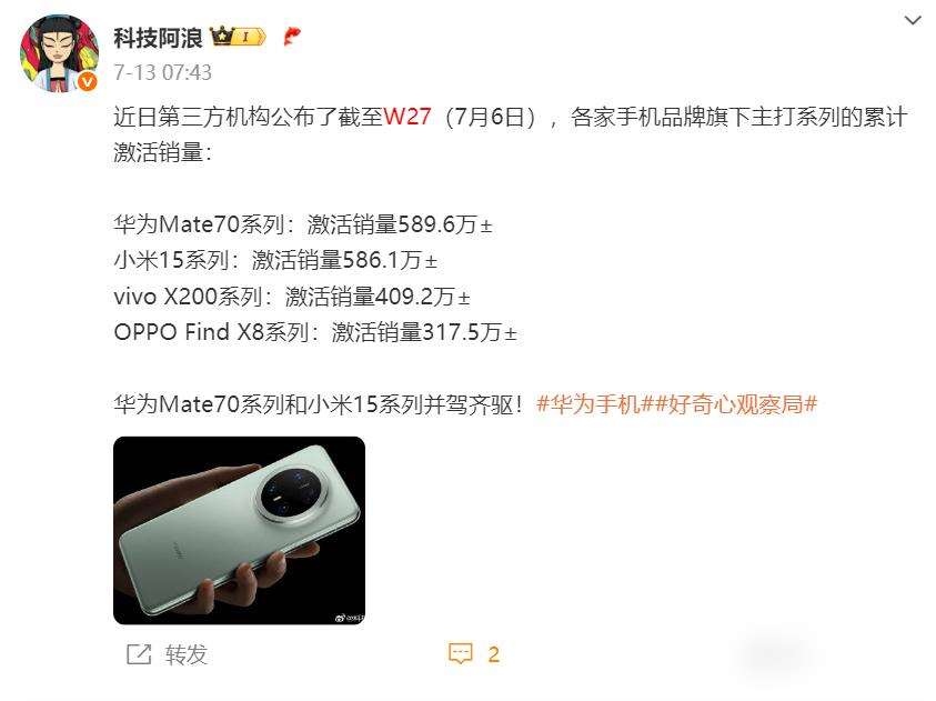 有博主統(tǒng)計激活量,華為Mate70激活589萬,vivo X200系列409萬,OPPO Find X8系列317萬。華為用降價和新技術(shù)搶市場,小米靠多出新機(jī)占便宜,vivo影像功能吸引人。