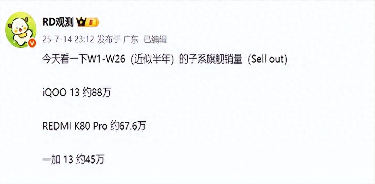 2025上半年銷量數(shù)據(jù)出來(lái)了,iQOO 13以88萬(wàn)臺(tái)碾壓對(duì)手奪冠,秘訣就倆字:差異化。