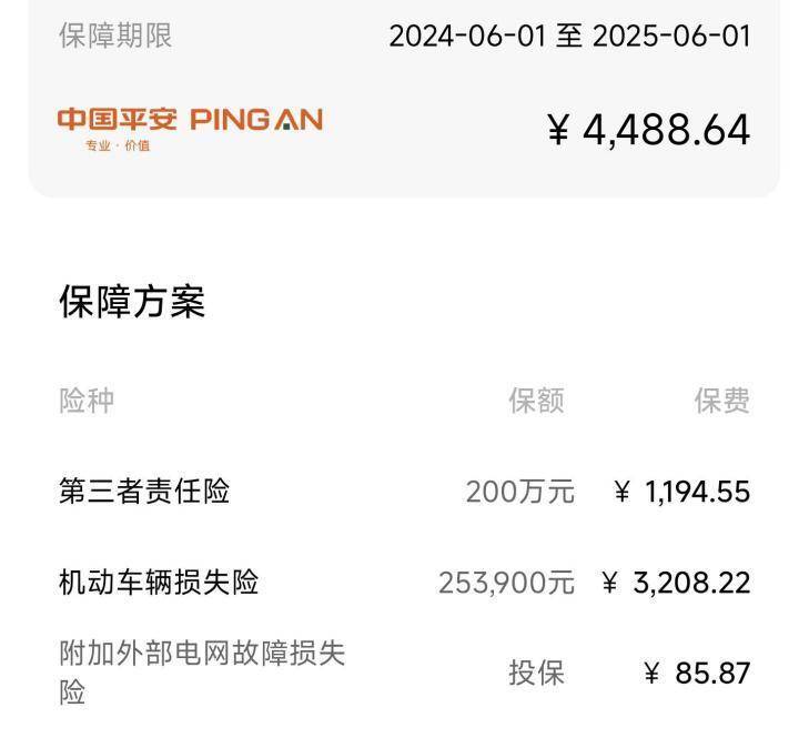 以同事的小米SU7 Pro在北京為示例。投保的平安保險新能源汽車商業險,包含200萬元三者責任險,保費1194.55,車輛損失險保額25.39萬元,保費是3208.22元,另外還有外部電網故障損失險,保費是85.87元,首年保費總額4488.64元。