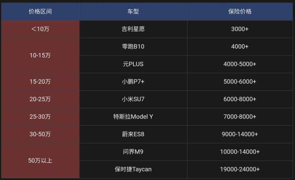 不同價格區間的主流車型,其保險價格我們也一并進行了核查,大致區間如下:
