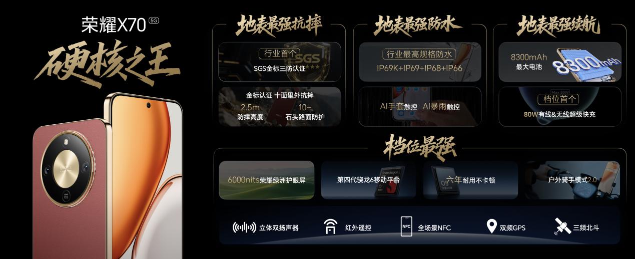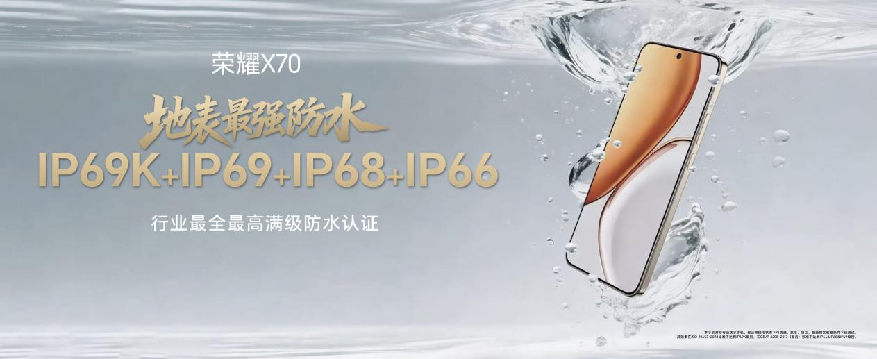 另外,榮耀 X70 在防水上實現突破性升級,成為主流廠商中首個達到 IP69K 工業級防水標準的機型,更具備 IP69K、IP69、IP68、IP66 行業最全最高滿級防水認證,防水性能達到了專業戶外三防機標準,在行業首次實現航海級密封防護。