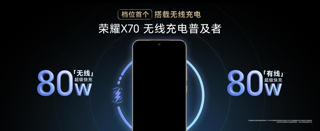 續航上,榮耀 X70 搭載了容量高達 8300mAh 的第三代青海湖電池,硅含量突破 10%,顯著領先同檔位產品,其綜合場景亮屏時長可達到 18 小時,單場景續航中短視頻播放 27 小時,微信視頻通話 16 小時。同時,榮耀 X70 是檔位首個配備 80W 無線超級快充和 80W 有線超級快充的機型,并在智慧節電引擎和抗老化引擎的加持下,遇到只有 2% 剩余電量的情況也能實現長時間通話和待機,達到六年持久耐用。