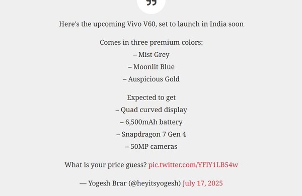 外媒猜測,vivo V60預計8月19日在印度上市(具體以官方公布為準)。
