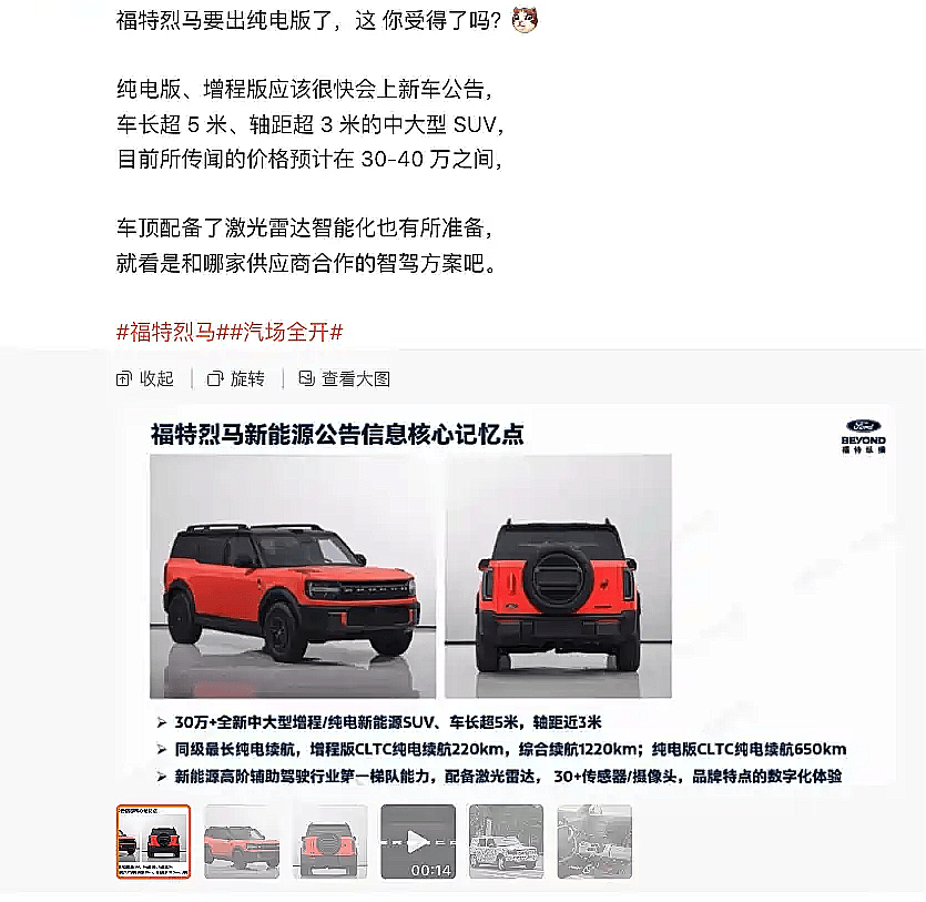 7月16日,有博主發布關于福特烈馬新能源版本的消息。