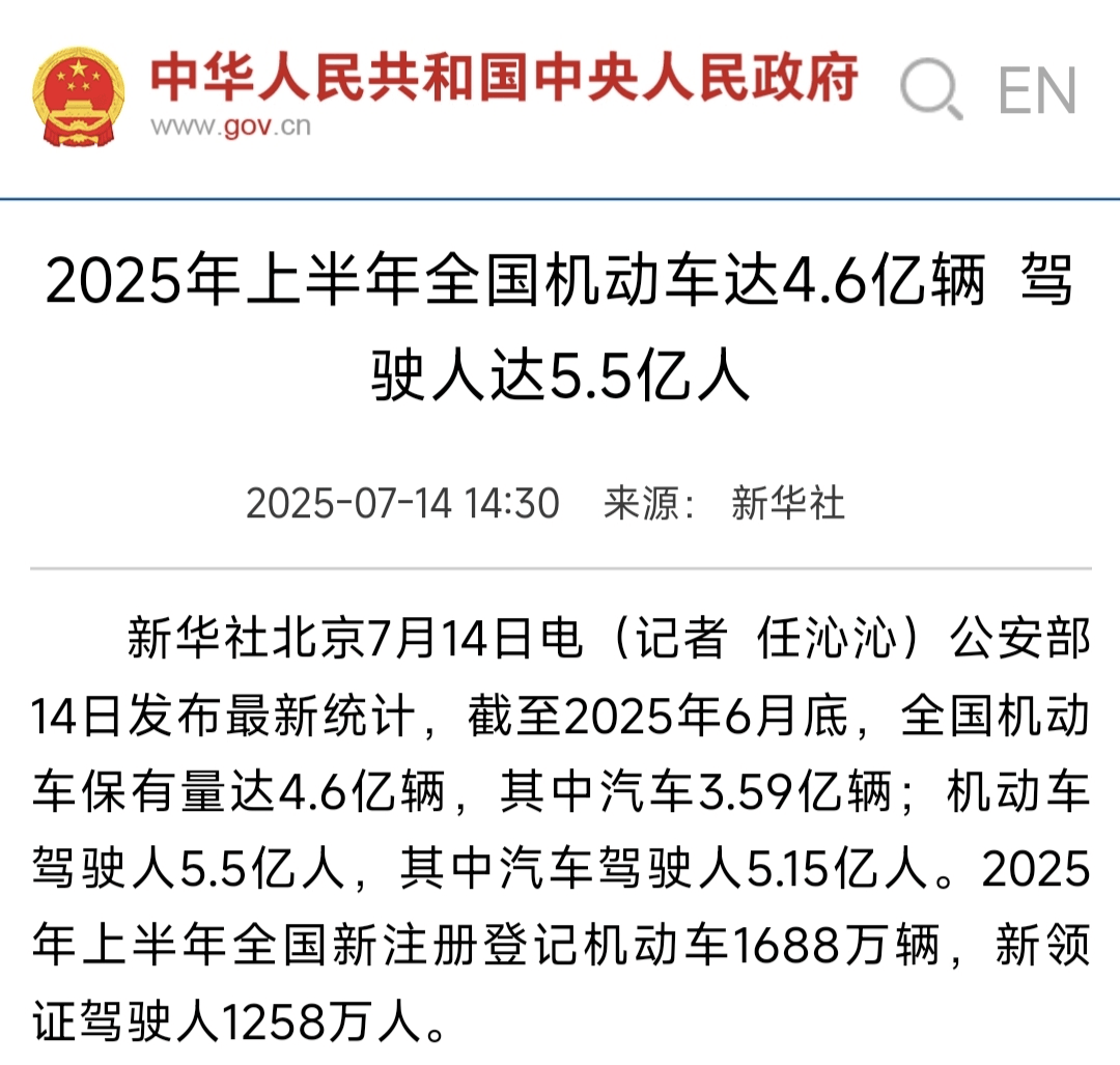 近兩天,中國汽車市場迎來了一個具有里程碑意義的時刻。公安部最新統計數據顯示,截至2025年6月底,全國機動車保有量達4.6億輛,其中汽車占比78%,總量達3.59億輛。與此同時,中國機動車駕駛人數量攀升至5.5億人,其中汽車駕駛人為5.15億人,占駕駛人總數的93.68%。