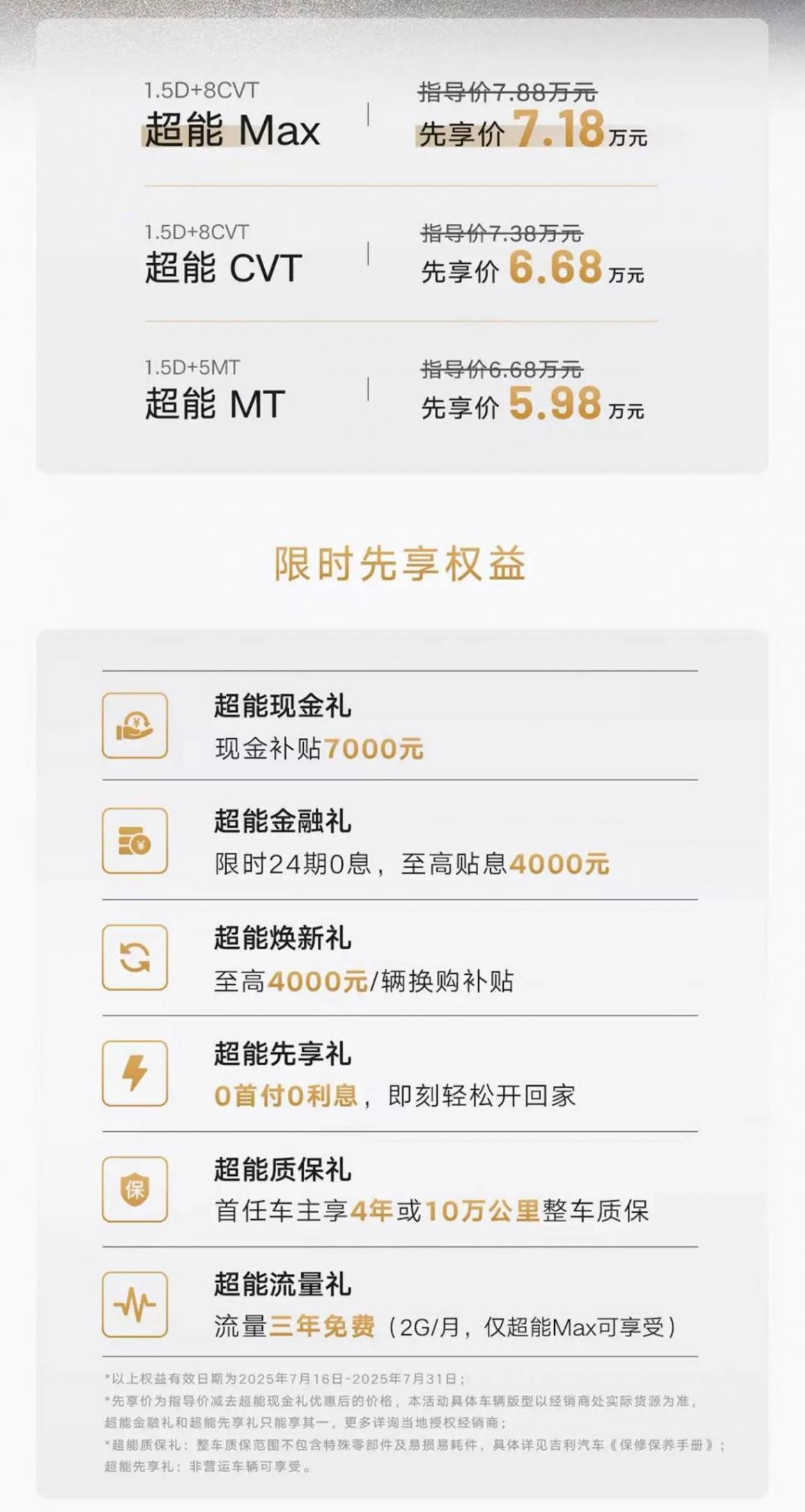 2025年7月16日,吉利汽車旗下繽越超能版正式上市,新車共計3款車型,官方指導價6.68-7.88萬元,先享價為5.98-7.18萬元。吉利繽越是一款燃油小型SUV,新款車型為增配車型,內飾有細微調整,并搭載搭載1.5L缸內直噴發動機。