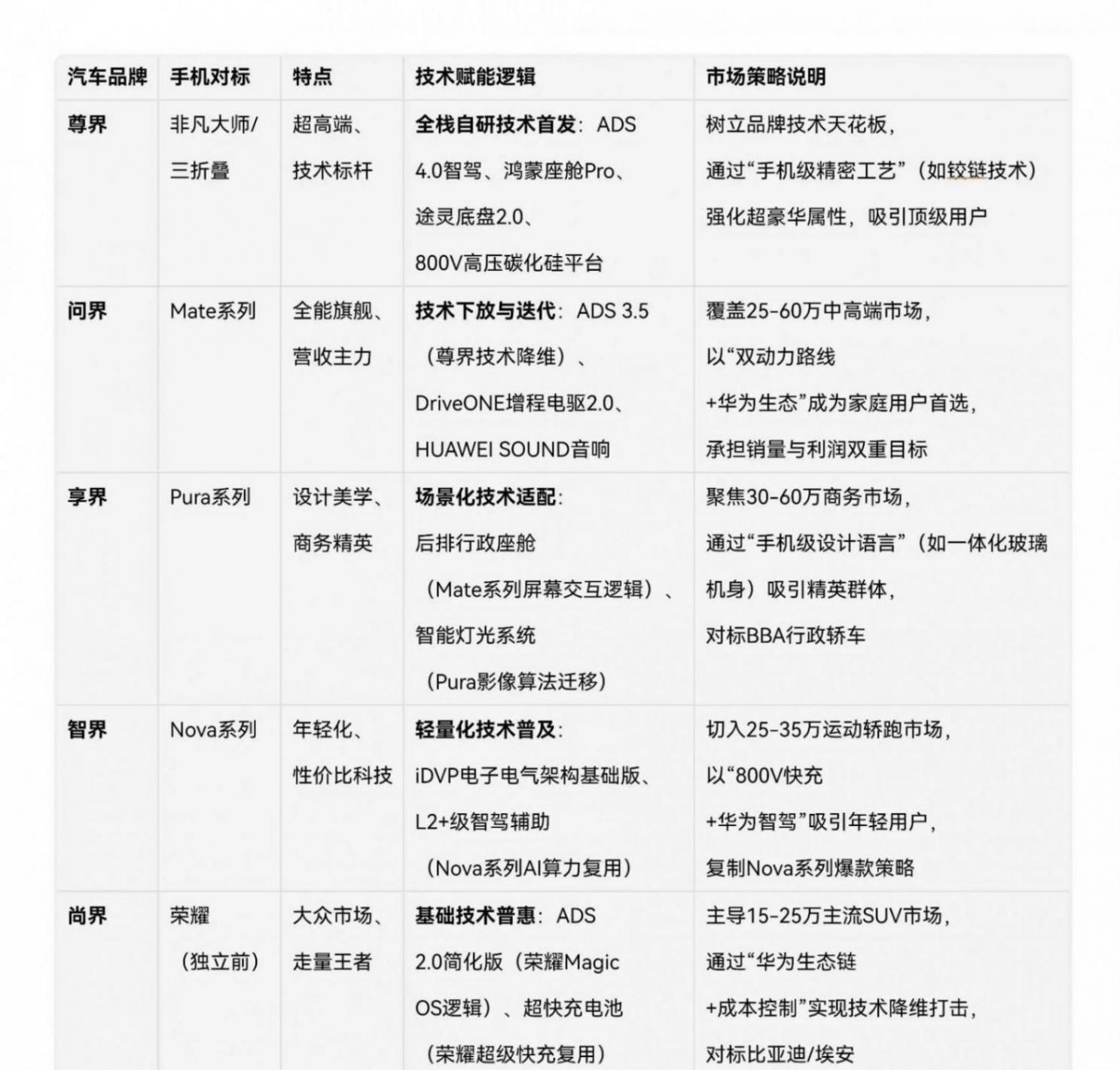 華為給每個(gè)等級(jí)車型都配了核心技術(shù),百萬豪車用昇騰芯片和ADS4系統(tǒng),便宜車也有鴻蒙座艙。這樣不管貴的便宜的,都帶著華為的技術(shù)標(biāo)簽。五家車企分工明確,華為只負(fù)責(zé)造技術(shù),不自己造整車。