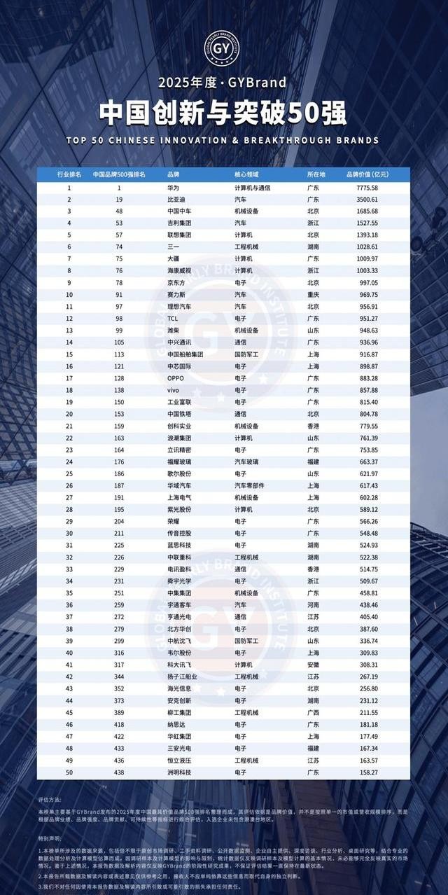 刷到GYBrand剛發布的2025創新50強榜單,華為比亞迪穩坐前二。