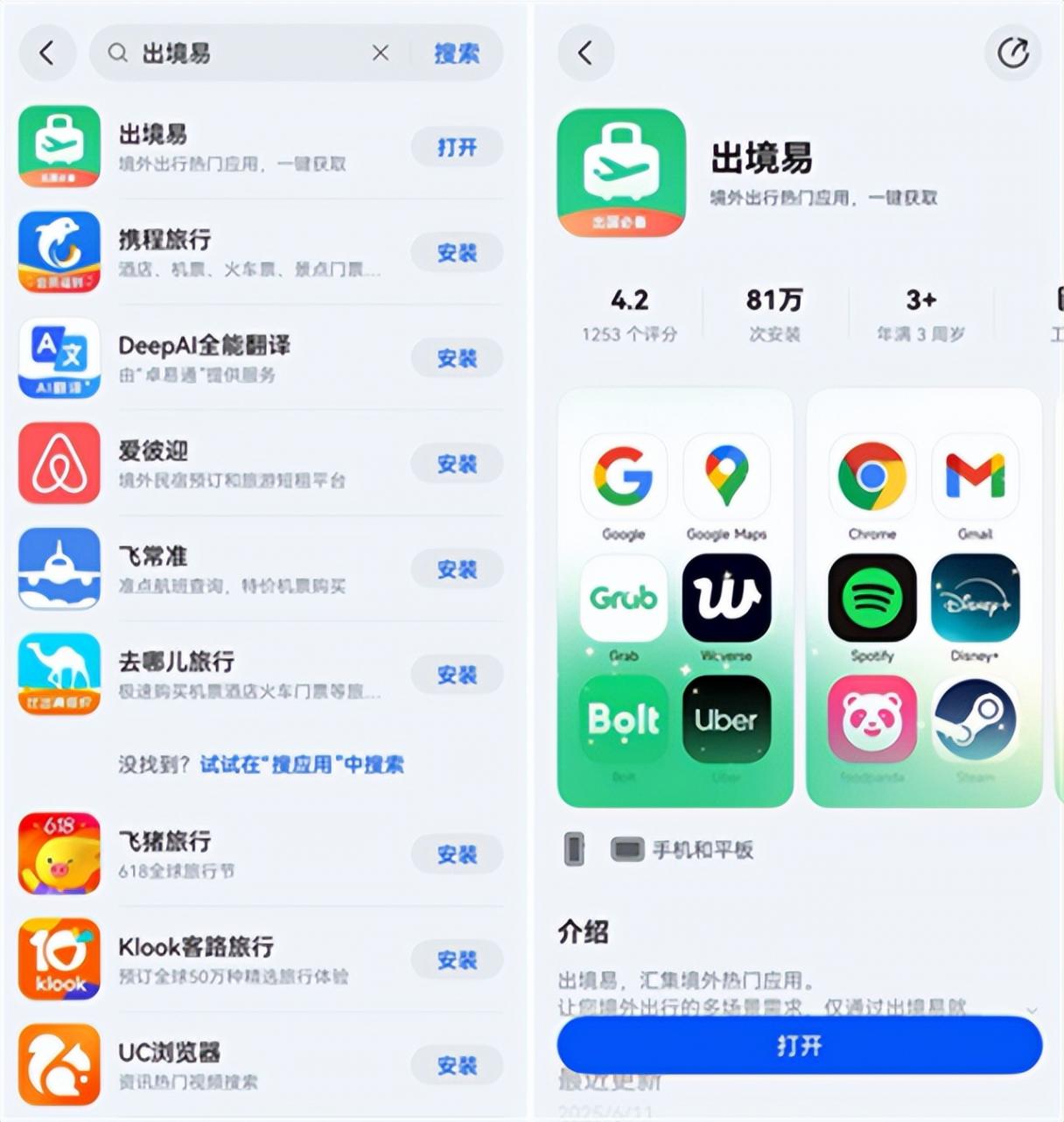 華為手機可以通過系統的應用市場下載出境易APP,帶來一站式的境外APP解決方案。對于出行、住宿、飲食等方面都有涉及,例如Uber打車、foodpanda外賣、Tripadvisor酒店預訂等,都能在出境易中一鍵下載安裝,同時,出境易APP還可以兼容Google Maps等,能夠根據你的旅行目的地推薦當地常用APP、簽證百科和匯率查詢等,讓出境旅行更方便。