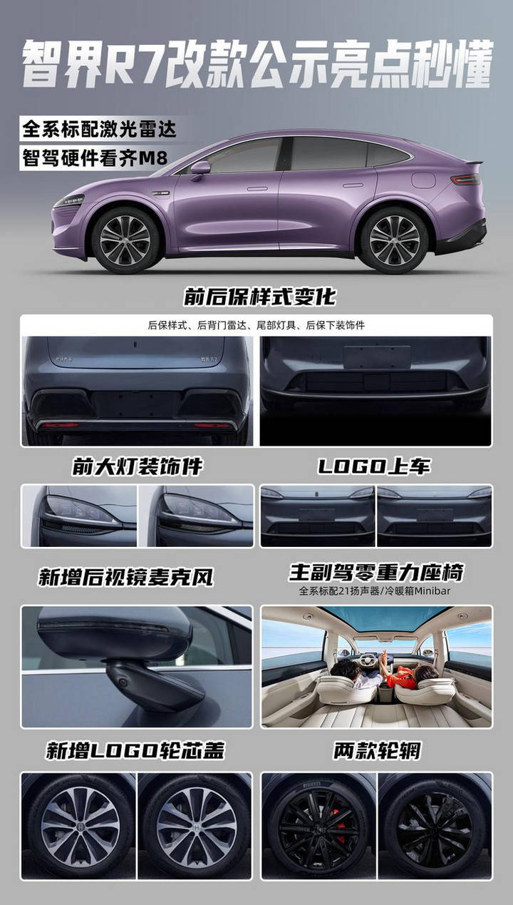 R7在外觀上進行了細節調整,車頭、輪轂、方向盤均換裝了最新樣式車標,前燈組下方兩側導流槽取消了現款的紋路造型,整體更加協調。內飾方面,新車將配備主副駕零重力座椅,全系標配21揚聲器音響系統以及冷暖箱。