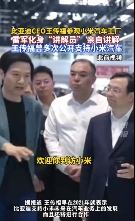 據界面新聞7月18日消息,多名網友近日在社交平臺發視頻稱,在小米汽車工廠,偶遇小米集團創始人雷軍和比亞迪董事長兼總裁王傳福會面。 視頻畫面中,王傳福在雷軍的陪同下參觀小米汽車工廠,雷軍親自化身“講解員”,為王傳福介紹起小米工廠的情況。雷軍身后一位穿短袖的男士,疑似為順為資本投資合伙人胡崢楠,他曾擔任吉利汽車研究院院長。