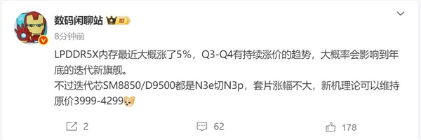 7月18日消息,博主數碼閑聊站表示,LPDDR5X內存最近漲了約5%,Q3-Q4有持續漲價的趨勢,大概率會影響到年底的迭代新旗艦,不過驍龍8 Elite 2的套片漲幅不大,理論上迭代旗艦能夠維持原價。