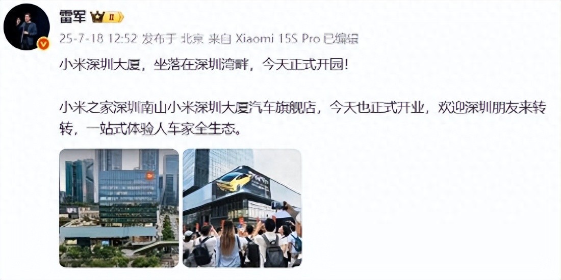 小米深圳大廈今天正式開(kāi)園,小米集團(tuán)CEO雷軍:歡迎深圳朋友來(lái)轉(zhuǎn)轉(zhuǎn),一站式體驗(yàn)人車家全生態(tài)
