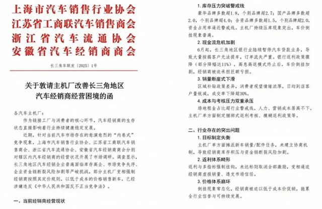 面對持續加重的渠道壓力,經銷商開始尋求集體發聲的解決之道。6月30日,滬蘇浙皖四地汽車流通協會聯合發布“長三角車聯發(2025)1號文件”,詳細披露了當前經銷商面臨的困境:居高不下的庫存壓力、日益緊繃的資金鏈條,以及持續加碼的考核指標等問題。