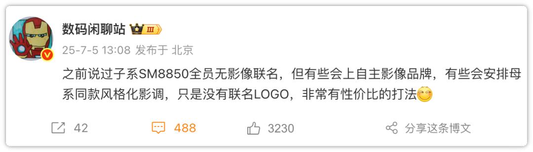 因為之前站哥爆料稱:“之前說過子系SM8850全員無影像聯名,但有些會上自主影像品牌,有些會安排母系同款風格化影調,只是沒有聯名LOGO,非常有性價比的打法”