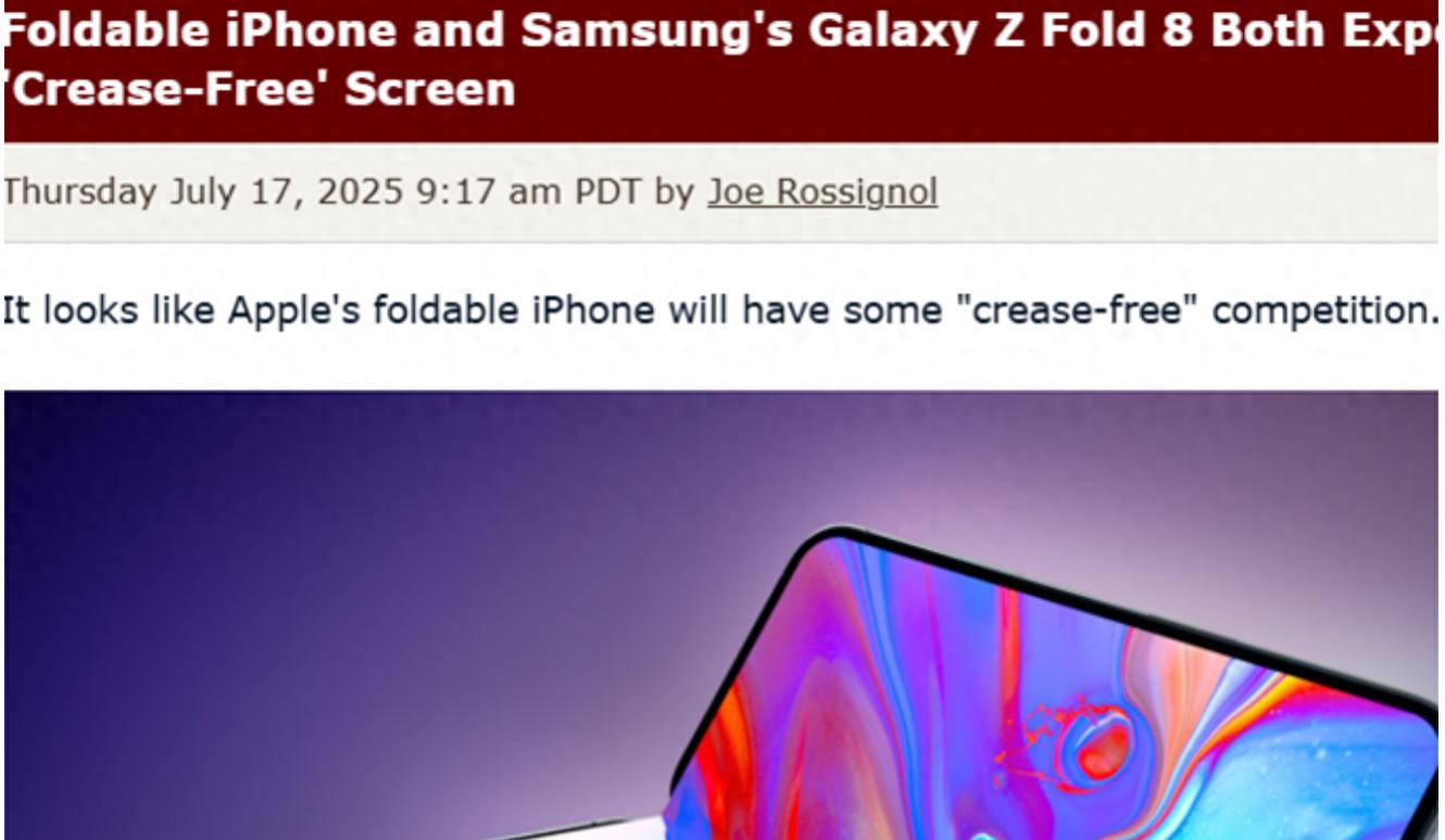 7月18日,據(jù)外媒報道,蘋果可折疊iPhone將迎來強勁對手,三星Galaxy Z Fold 8也有望采用“無折痕”屏幕。