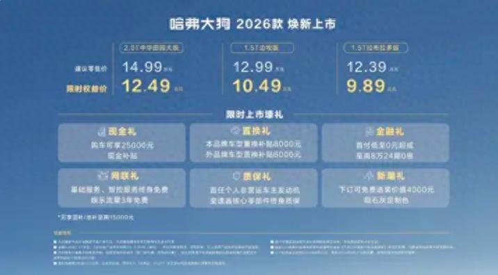 近日,Auto情報處從長城汽車官方處獲悉,2026款哈弗大狗正式上市,哈弗大狗定位緊湊型SUV,2026款共推出3款配置車型,指導價為12.39萬元-14.99萬元,權益價9.89萬元起,2026款車型對外觀內飾進行了調整,配置也得到升級,繼續搭載1.5T和2.0T發動機。
