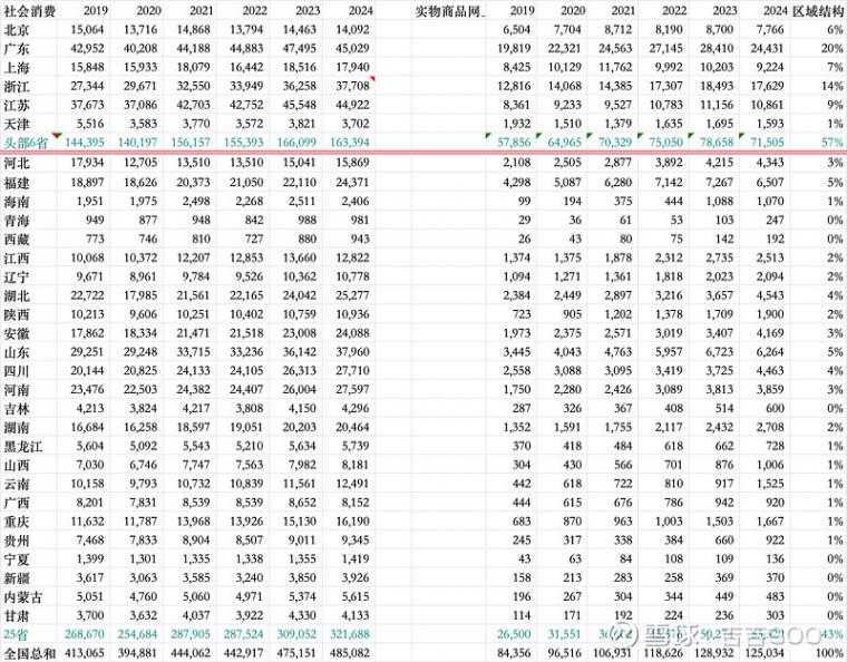 2024年,頭部6省的實物商品網上零售額高達71505億,在全國占比達57%;而其他25省的實物商品網上零售額為53529億,占比43%;全國總額為125034萬億(采用支付口徑),具體各省的占比情況詳見后文所附數據。