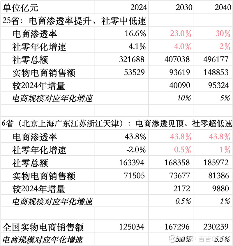 假設25省的長期電商滲透率上限為30%(相較于6省當下44%的滲透率仍存在差距),社會消費品零售總額(社零)相關假設不再贅述,具體數據可查看表格,且各項假設均較為保守。