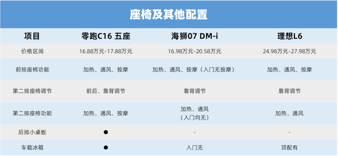 本以為它價格低,配置會低,橫向看了看比亞迪海獅07 DM-i和理想L6,后排的配置都缺少了小桌板或者冰箱之類。我是想不到零跑竟能把“小理想”名號貫徹得如此徹底,冰箱、彩電、大沙發全都有。