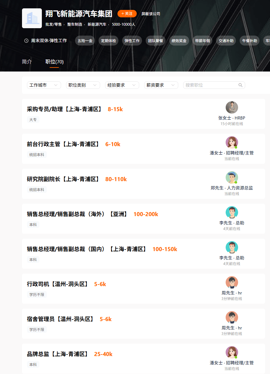 值得注意的是,與此同時(shí),在第三方招聘網(wǎng)站上出現(xiàn)了大量關(guān)于翔飛汽車的招牌信息。上到年薪200萬元的研究院副院長(zhǎng)、銷售總經(jīng)理,下到月薪4000元行政司機(jī)、人力資源助理,儼然一幅重整旗鼓的模樣。