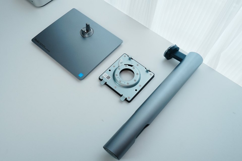 內部配件非常豐富,銀灰色方形底座和支架,還有說明書、校色報告、calman 色彩認證證書、電源線、Type-C和HDMI線各一根,無外置電源適配器的設計必須好評,布置桌面時可以更簡潔。