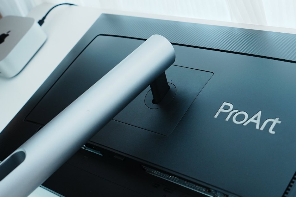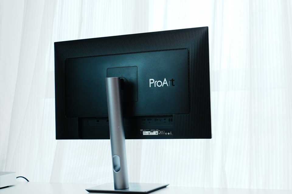 背面設計如上圖,沒有華碩的標,只有ProArt字樣低調的告訴懂的人其與眾不同。弧形背板搭配側邊的豎條紋裝飾及銀色支架,倆字形容就是和諧。