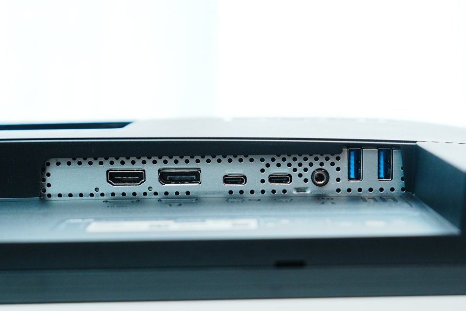 顯示器接口全部設計在了底部左右兩側。兩個 HDMI 2.0 接口和兩個 DP 1.4 接口已經非常豐富,但是其還有兩個可以外接鍵鼠的USB-A接口,一個支持高速數(shù)據(jù)傳輸及最高96W設備供電的全能USB Type-C 接口,一個3.5mm音頻接口。