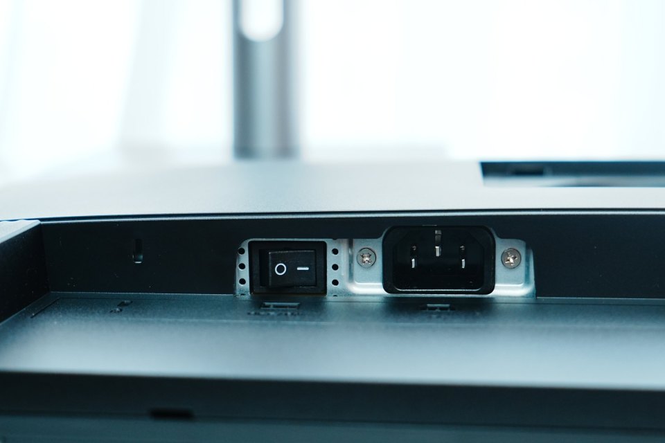 顯示器安裝好底座后整體效果如上圖,正面采用三面窄邊框設計,底部稍寬也不到20mm,搭配拉絲紋理的處理,整體質感和檔次都很不錯。