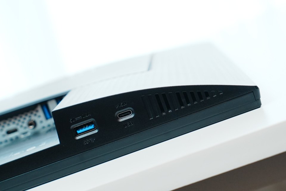 除了背部的豐富接口外,其在機身右側的底部還設計了一個Type-C 接口、一個 USB 3.2 接口。這倆接口不僅可以為設備充電而且可隨意連接鍵盤、鼠標、SSD、耳機等設備,相當于給電腦增加了一個外置拓展塢,這點必須好評。