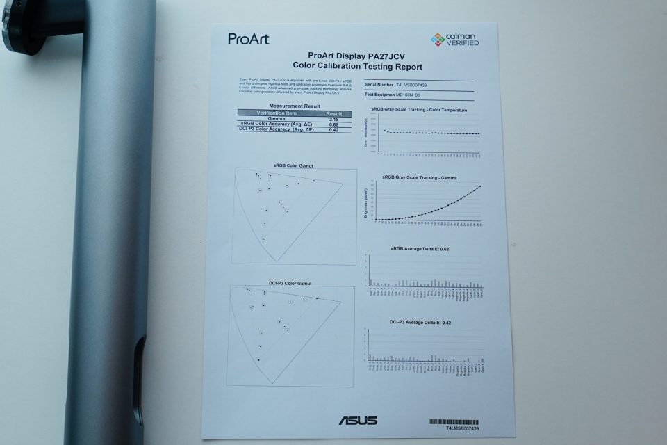 華碩ProArt 創(chuàng)夢 5K的顯示器出廠都經過預校準并通過Calman 認證,且包裝內附帶了校色報告,筆者這臺顯示器的色準ΔEsRGB模式下為0.68,DCI-P3模式下為0.42,對于一臺27英寸的顯示器而言,這個色準很可以。