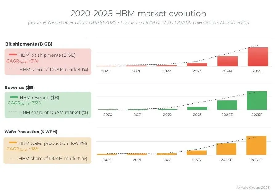 知名分析機構Yole在今年三月發布的一個報告中稱,自2022 年底 ChatGPT 橫空出世以來,生成式人工智能蓬勃發展,推動 2023 年 HBM 比特出貨量同比增長 187%,增幅空前,2024 年更是飆升 193%。