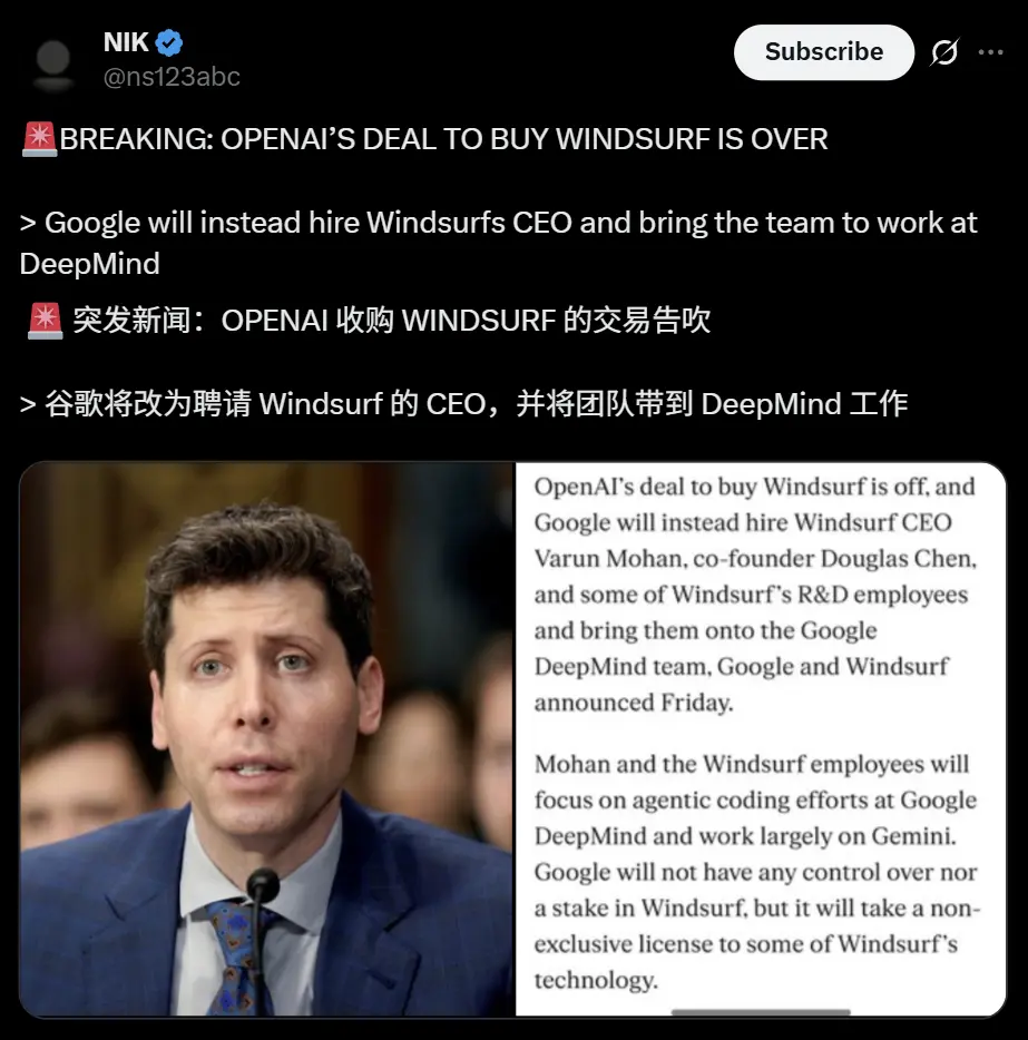 周五晚上,消息爆出,谷歌跟Windsurf簽了個24億美元的許可協議,大部分錢都進了股東的口袋。