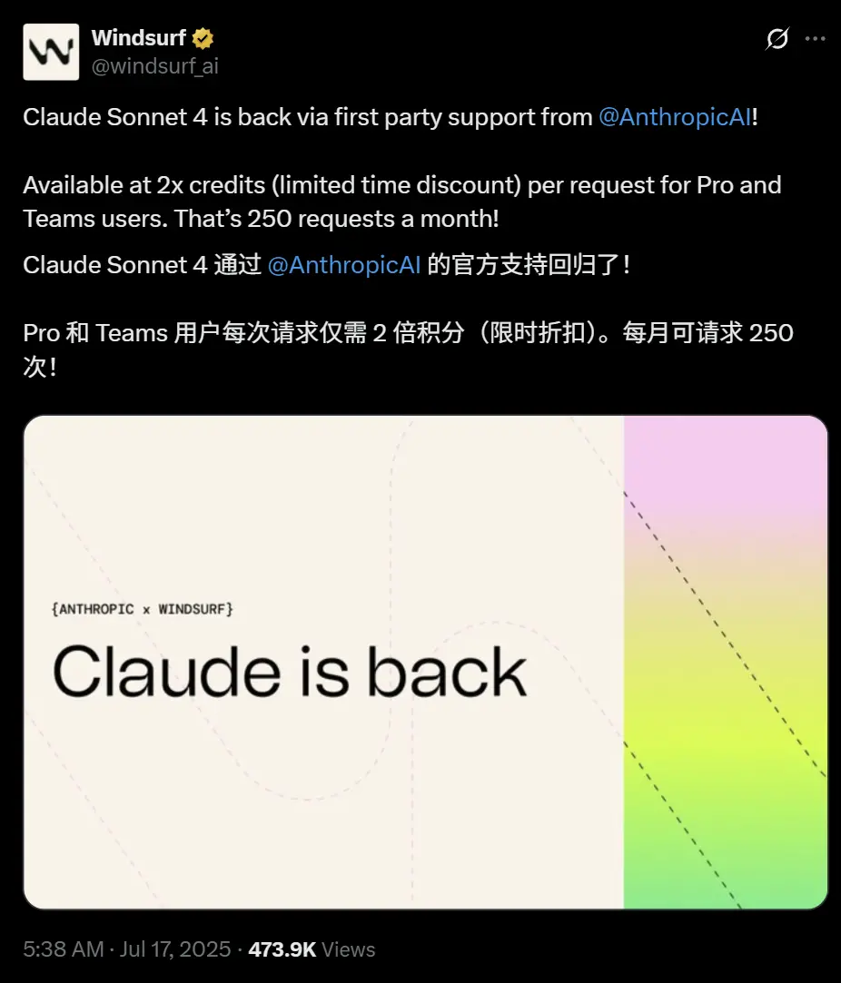 他們的AI編程工具部分依賴Anthropic的模型,但6月份,Anthropic突然掐斷了Windsurf的模型使用權限。