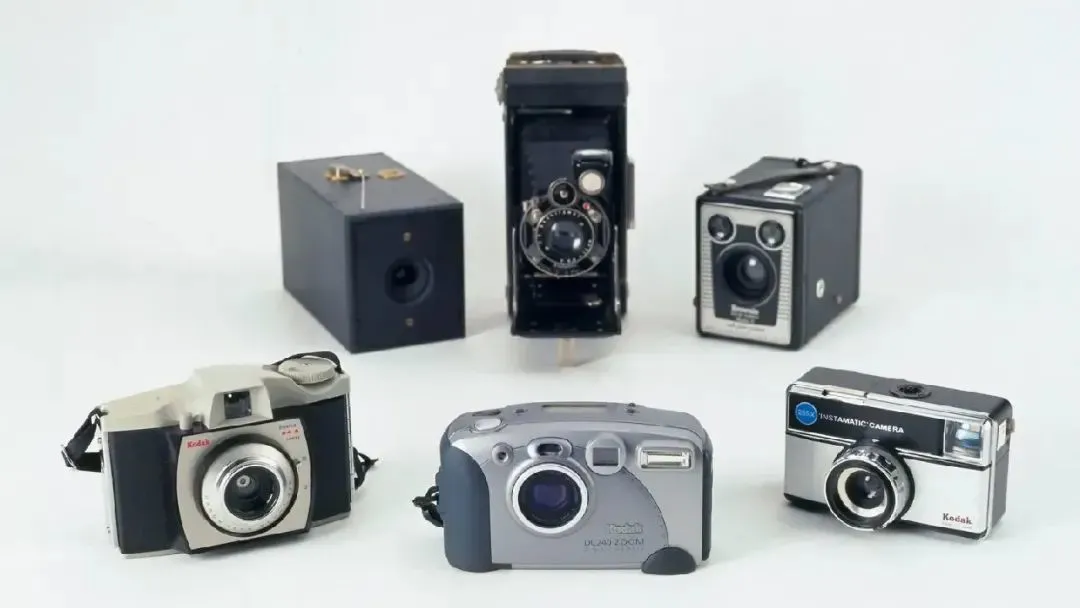喬治·伊士曼1888年發明的首款柯達相機(左后)、折疊式相機、布朗尼盒式相機、傻瓜相機,以及1999年推出的數碼相機(前中)。圖片來源:SSPL/GETTY IMAGES