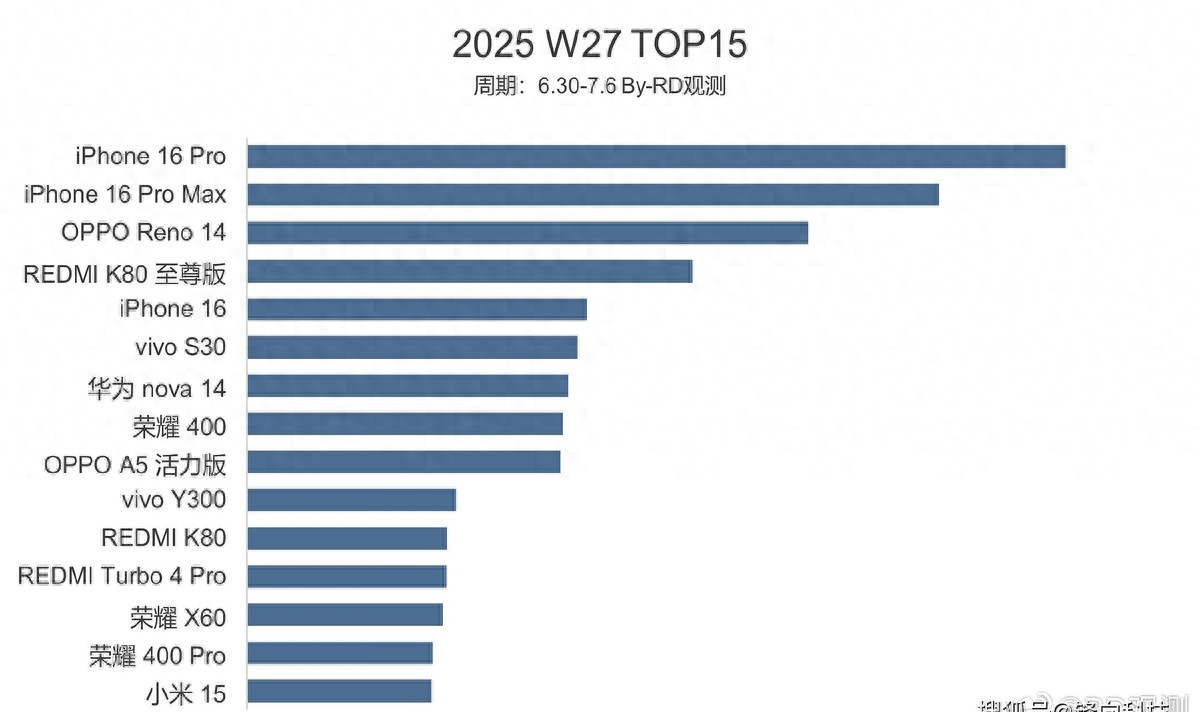 W27周數據清清楚楚:OPPO Reno14穩坐季軍,Redmi K80至尊版緊隨其后排第四,蘋果的iPhone 16直接跌到第六名。