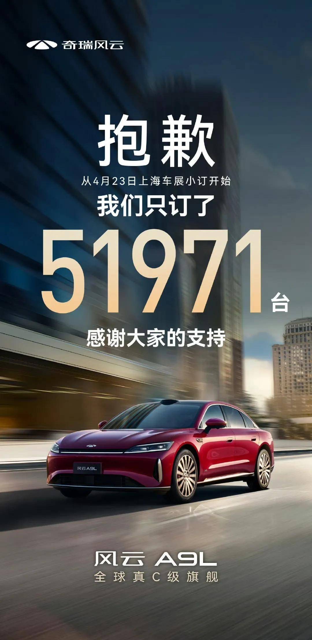 然而在同一天,“頭鐵”的奇瑞風(fēng)云A9L發(fā)了一張海報(bào),并配文:“抱歉……我們只訂了51971臺(tái)。”