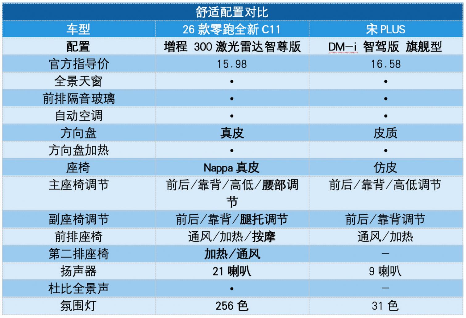 那么,26款的零跑全新C11和宋PLUS各自有哪些優勢?誰更值得推薦呢?本文將通過舒適空間、輔助駕駛能力以及行駛表現三個維度解析,話不多說,下面就一起來聊一聊。