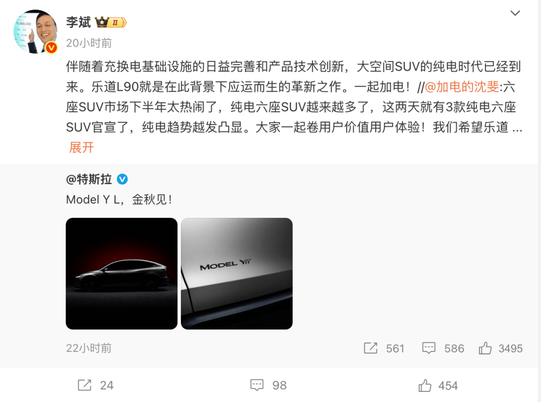 李斌也轉(zhuǎn)發(fā)特斯拉上述博文并表示:“伴隨著充換電基礎(chǔ)設(shè)施的日益完善和產(chǎn)品技術(shù)創(chuàng)新,大空間SUV的純電時(shí)代已經(jīng)到來。”同時(shí)還不忘宣傳自家產(chǎn)品:“樂道L90就是在此背景下應(yīng)運(yùn)而生的革新之作”。此外,蔚來高級副總裁兼樂道汽車總裁沈斐也指出:“六座SUV市場下半年太熱鬧了,純電六座SUV越來越多了,這兩天就有3款純電六座SUV官宣了,純電趨勢越發(fā)凸顯。大家一起卷用戶價(jià)值用戶體驗(yàn)!”