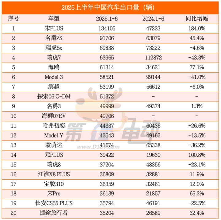 和海獅07 EV的出口表現同樣可圈可點。海鷗上半年出口量突破6萬輛,同比大漲超 77%,排名從去年同期的第14位躍升至前五;海獅07 EV出口量逼近5萬輛,成為上半年中國汽車出口的新晉黑馬。