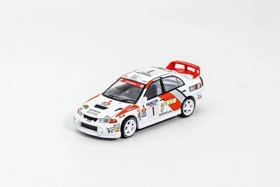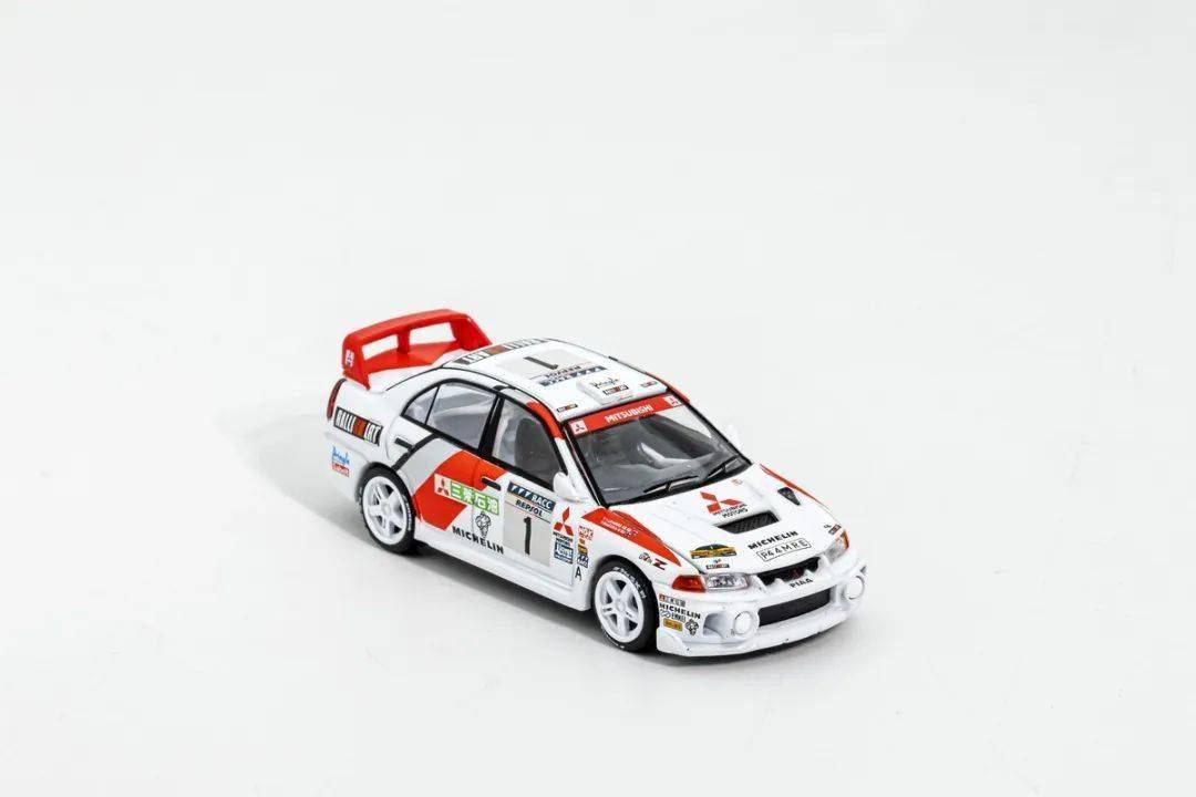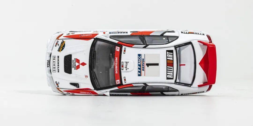 模型的形準只能說基本沒問題,EVO IV短小精悍的外形,模型也算還原到位;這次試玩的EVO IV為拉力賽車版本,底漆是白色漆,漆面質感還不錯,縫隙啥的也在正常范圍內,賽車拉花應該都是移印的,整體效果還行;模型側轉向燈也是浮雕+移印的,車門把手為浮雕刻畫,模型的側包圍為浮雕刻畫,前唇的側風刀貌似非鏤空;模型的車窗有黑色邊框,B柱為浮雕+涂黑刻畫;車外后視鏡改成拉力賽車款,很小巧。