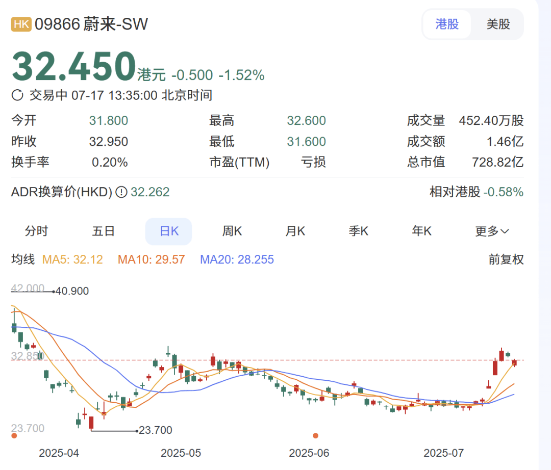 蔚來汽車(09866.HK)股價繼7月11日大漲近6個點后,14日繼續強勢拉升,股價報32.35港元/股,漲幅10.60%。