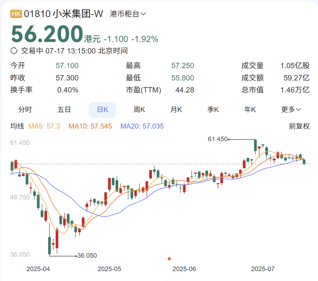YU7上市后,小米集團(01810.HK)的股價也持續攀升,截至17日中午,總市值為1.46萬億港元。